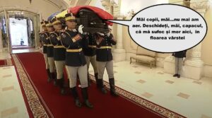 Marinelu’ la catafalcul lui nea Nelu. De emoție, și-a șters o lacrimă de krakadil, cu o cârpă kaghebistă. Apoi, nu s-a putut abține și a ras o juma de frecție Galenica, primită în dar de la un pelerin pensionar.